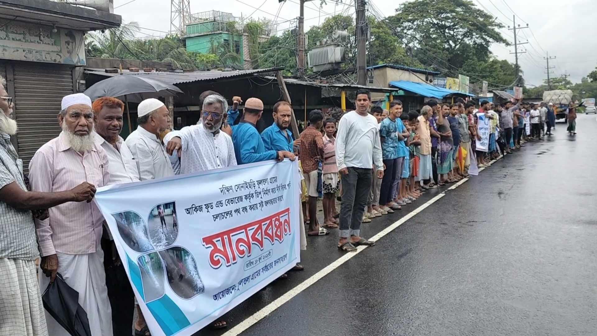 জলাবদ্ধতা নিরসনের দাবীতে সোনাইছড়ি গ্রামবাসীর মানববন্ধন