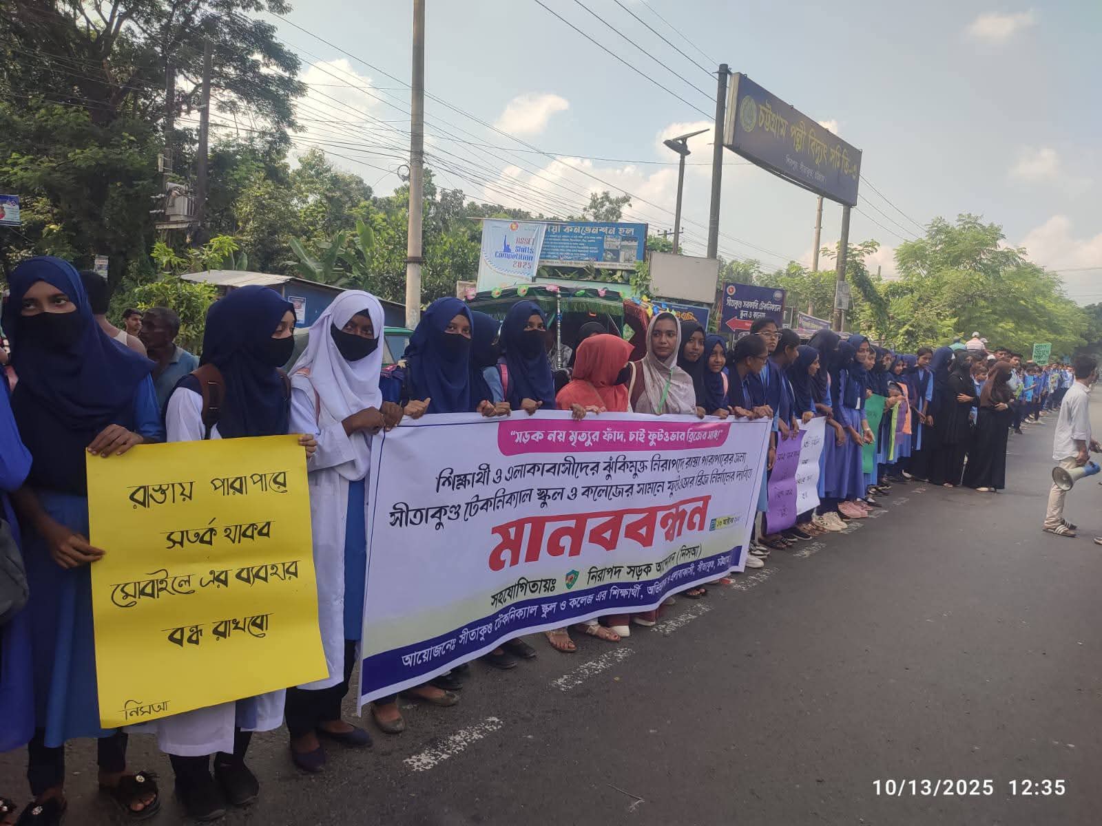 সীতাকুণ্ড সরকারি টেকনিক্যাল স্কুল অ্যান্ড কলেজের শিক্ষক, শিক্ষার্থী, প্রাক্তন শিক্ষার্থী ও এলাকাবাসীর উদ্যোগে ফুট ওভারব্রীজ নির্মাণের দাবিতে মানববন্ধন অনুষ্টিত হয়। আজ ১৩ অক্টোবর, সোমবার দুপুর ১২টায় কলেজের সন্মুখে ঢাকা-চট্টগ্রাম মহাসড়কে নিরাপদ সড়ক আন্দোলন, সীতাকুণ্ড শাখার আয়োজনে অংশগ্রহণকারীরা এক কণ্ঠে দাবি তুলেছেন —সড়ক নয় মৃত্যুর ফাঁদ, চাই ফুটওভার ব্রিজের সাধ!